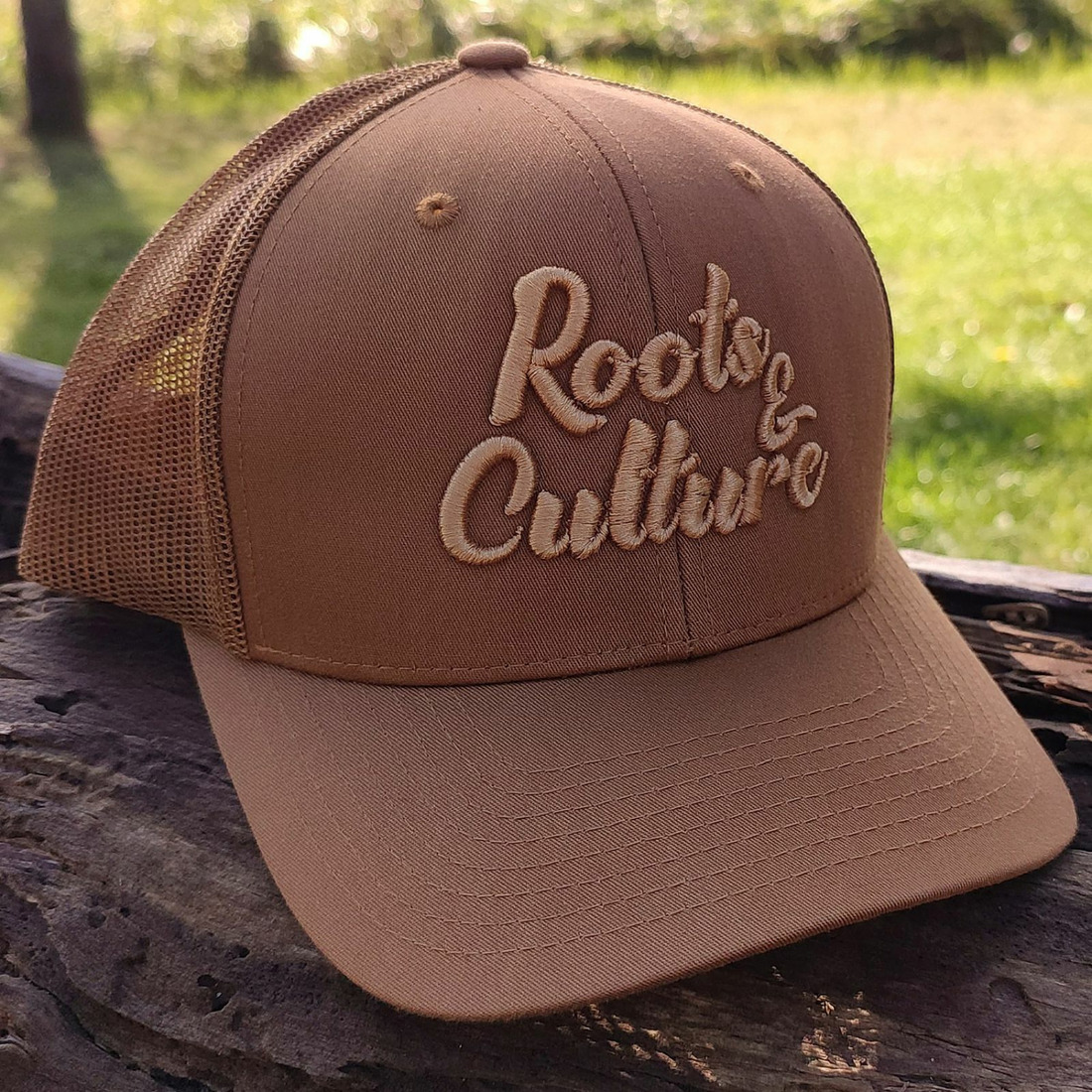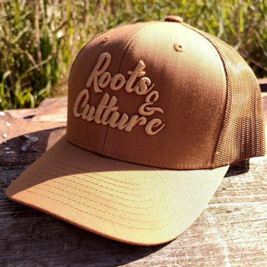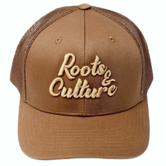 Stylová trucker čepice s vyšitým nápisem „Roots & Culture“ a prohnutým kšiltem