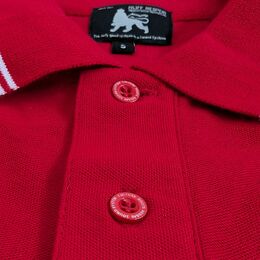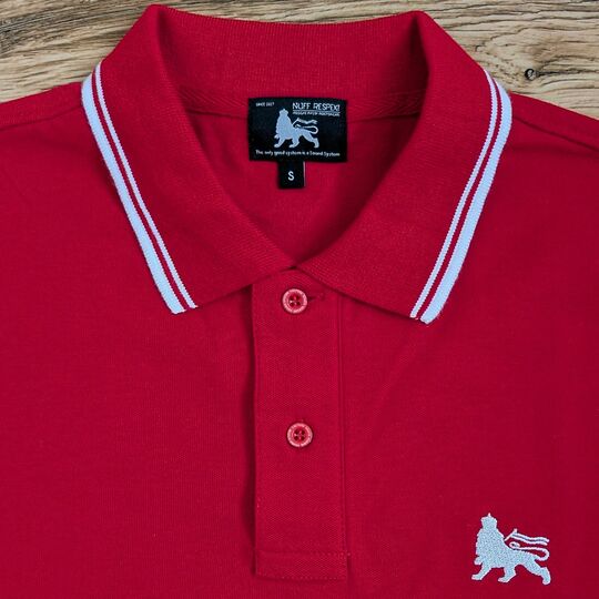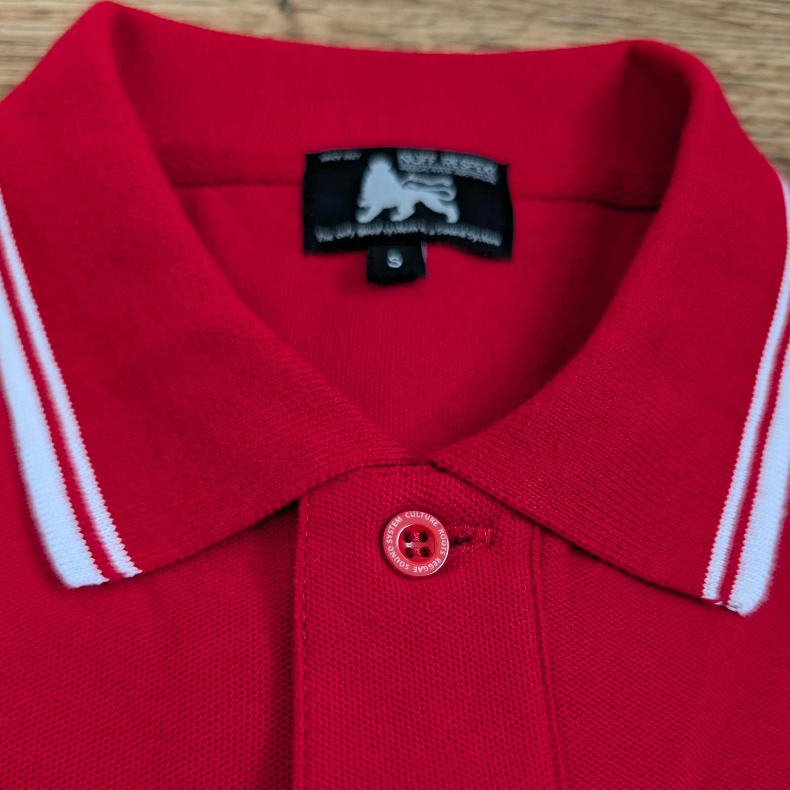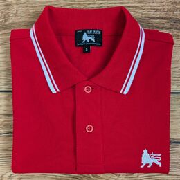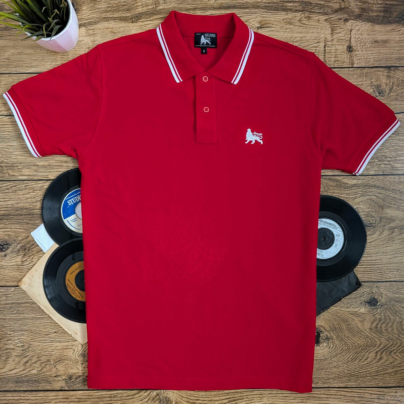 Elegantní polo tričko v zářivě červené barvě s jamajským duchem a symbolem Lva Judy – ideální spojení klasiky a reggae energie.